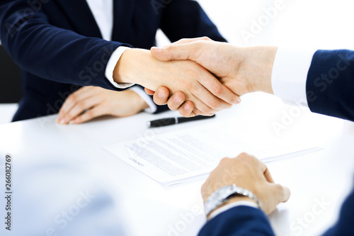 Business people shaking hands finishing up a meeting , close-up. Success at negotiation and handshake concepts. Group of lawyers at work