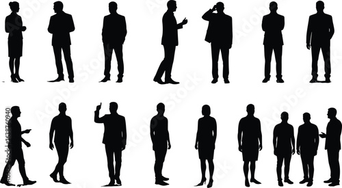 Business people silhouettes in formal attire, professional men and women walking, talking, interacting, communicating, teamwork, office environment, corporate meeting, leadership, handshake