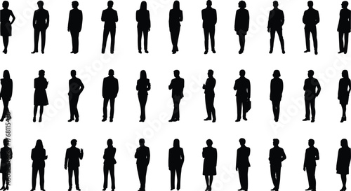 Business people silhouettes, standing human figures vector, professional poses illustration, office teamwork concept, black silhouettes art, modern workforce diversity design