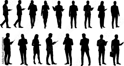 Business people silhouettes vector set, office workers, employees, communication, using devices