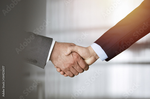 Business people standing and shaking hands in sunny office, close-up. Handshake and marketing