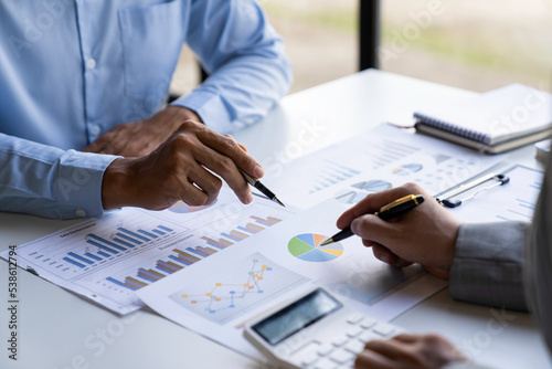 Business People Talking Discussing with concept coworker planning analyzing financial document data charts and graphs in Meetings and successful teamwork.