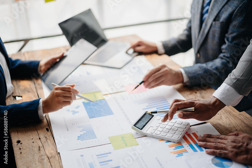 Business People Talking Discussing with financial document data charts and graphs Team business meeting with smart phone and laptop and digital tablet computer