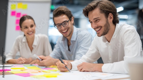 business, people, teamwork and planning concept - smiling business team with marker and stickers working in office, no logos, no brands