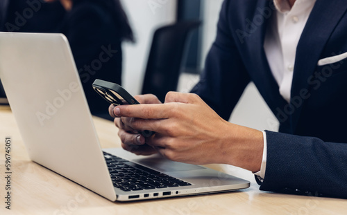 Business people using smart phone or computer for Chat GPT Chat with AI or Artificial Intelligence. Chat GPT, artificial intelligence Ai Chat GPT, AI technology to assist humans work.