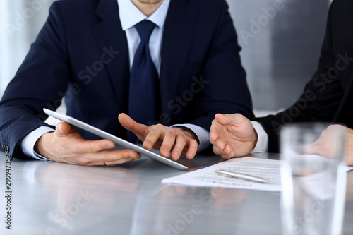 Business people using tablet computer while working together at the desk in modern office. Unknown businessman or male entrepreneur with colleague at workplace. Teamwork and partnership concept