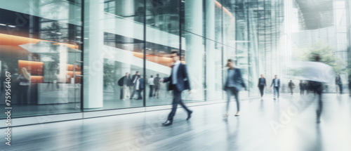 Business people walk in a large office lobby against a cityscape background. Motion blur effect, bright business workplace with people in walking in blurred motion in modern office space