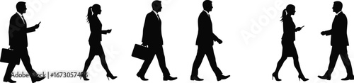 Business people walking silhouette, corporate professionals with briefcase, office workers in motion, men and women commuting, formal attire executive staff design