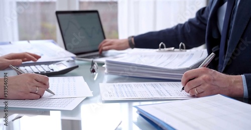 Business people wearing blue suits are reviewing financial data in office. Two professionals analyzing paper reports using calculators. Audit and taxes concept
