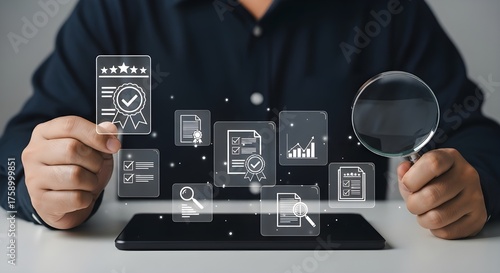 Business person holding a magnifying glass and a certificate icon symbolizing quality assurance, audit and compliance with digital technology and data analysis icons