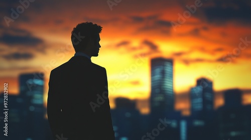 Business person silhouette overlaid with a city skyline, with ample copy space on the right.