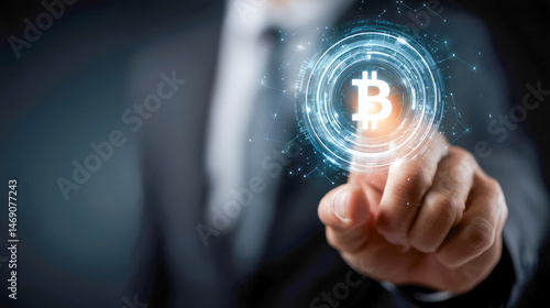 Business Person Touching Bitcoin Hologram on Touchscreen in Office