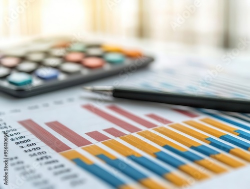 Business plan documents with financial projections and a calculator, focus on profitability