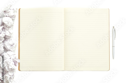 Business planning. Flat lay of crumpled paper ball pile, mockup note pad and pen isolated on white background. Copy space.