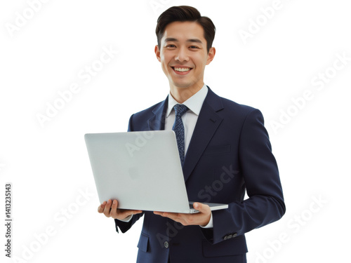 Business portrait isolated on white transparent background: A smiling Asian man in a dark suit and tie confidently holds a laptop while standing against a white background.