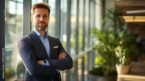 Business portrait of a man in a modern office, with large windows and natural light flooding the room