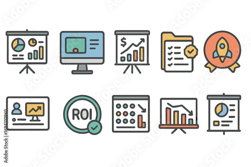 Business presentation icon set. growth metrics and data analysis icons line collection