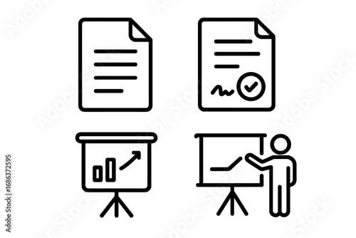 Business presentation line icon set. Document, contract, agreement, report symbol. Financial growth chart, data analysis graph. Person presenting. Editable stroke vector.