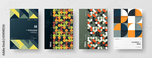 Business presentation vector A4 vertical orientation front page mock up set. Corporate report cover abstract geometric illustration design layout bundle. Company identity brochure template collection.