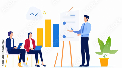 Business presentation with charts and graphs, showcasing teamwork and analysis in modern office setting. Engaging and professional atmosphere