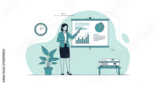 Business Presentation With Female Executive Pointing At Financial Charts Data