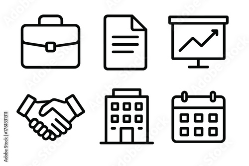 Business process outline icon set: briefcase, document, chart, handshake, building, calendar.