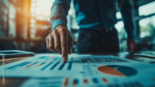 Business professional analyzes financial reports and data in a modern office setting during the afternoon