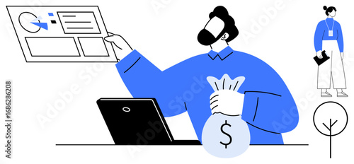 Business professional analyzing financial charts, holding money bag near laptop. Ideal for finance, business, investment, productivity, success, entrepreneurship startup themes. Minimalist flat