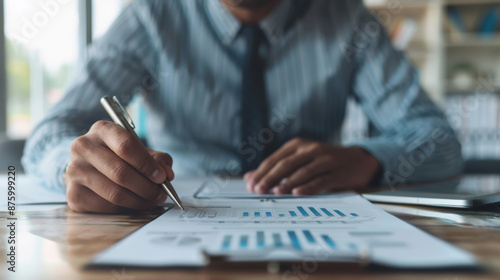 Business professional analyzing financial charts on paper at a desk, focusing on strategy and data interpretation in a modern office environment.
