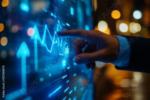 Business professional analyzing stock market trends on a digital touchscreen interface at night, with vibrant LED graphs illustrating financial data.