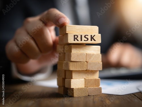 Business professional arranging wooden blocks to demonstrate the concept of risk