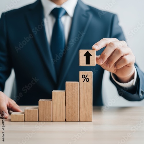 Business professional builds rising percentage graph with wooden blocks.