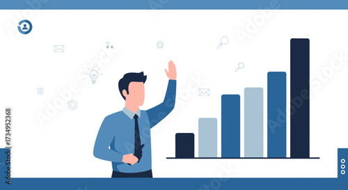 Business professional celebrating growth and success, visualized with financial charts, vector graphics