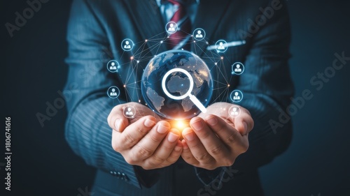 Business professional holds glowing digital globe featuring network connections and search icon