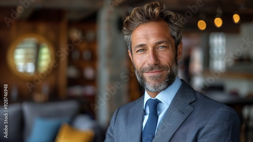 Business professional in a tailored suit poses confidently in a modern office setting during the afternoon