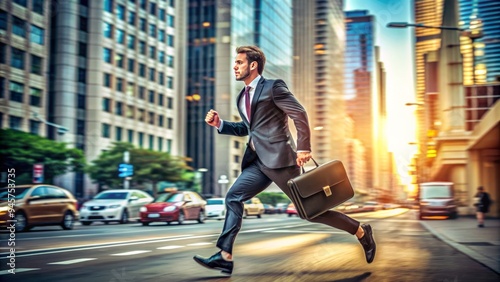 Business professional in suit and tie jogging on city street, briefcase in hand, with blurred background of skyscrapers and morning rush hour traffic.