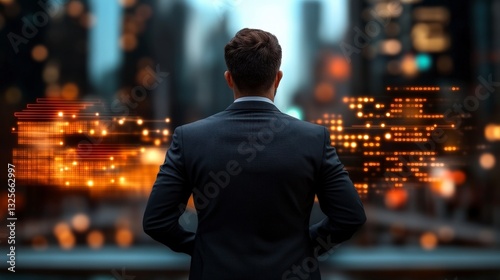 Business professional in suit looking at glowing city skyline with modern buildings and bright lights at dusk or evening time.