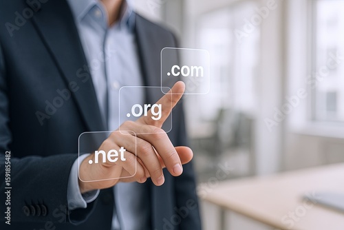 Business professional in suit using transparent digital website domain icons on touchscreen device.
