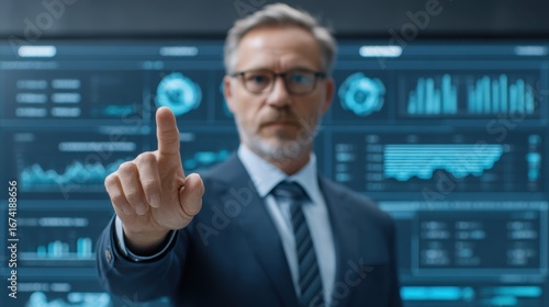 Business professional interacting with digital interface displaying graphs and data analytics in a modern corporate environment
