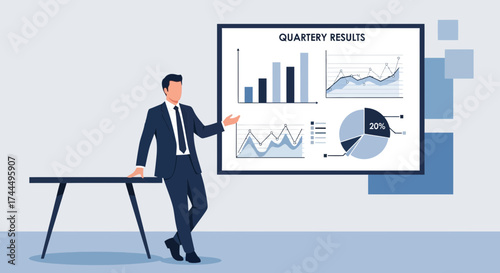 Business Professional Presenting Quarterly Results Charts and Graphs Information Analysis Report