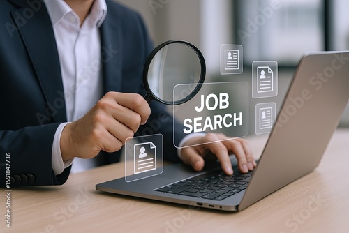 Business Professional Searching for Job Opportunities Using Computer and Magnifying Glass.
