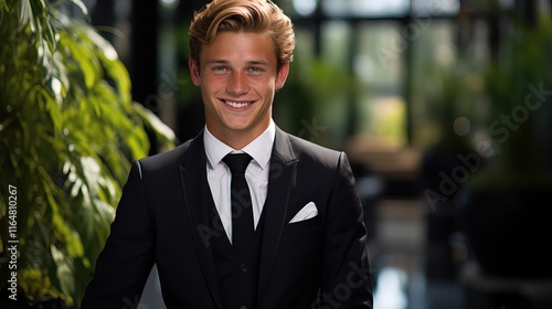 Business professional smiling during a cordial negotiation, exuding confidence and approachability in a sleek office setting.