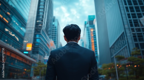 Business professional standing in modern city, looking up at skyscrapers, representing ambition, growth, and urban lifestyle aspirations.