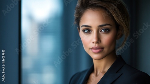 Business professional stands confidently in an office with a city view, highlighting her poise and grace