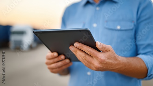Business professional using a digital tablet in an outdoor setting surrounded by transportation vehicles showcasing modern logistics solutions and efficient virtual management strategies