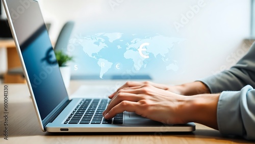 Business professional using a laptop for international finance, with a holographic world map and currency sign projection. Fintech and global trade concept.