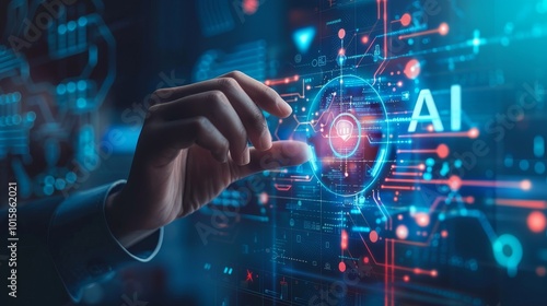 Business professional using AI technology for data analysis and advanced marketing, web banner with blue background and "AI" text, high-resolution.