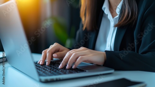 Business professional working on a laptop in an office setting, emphasizing productivity and modern work environment.