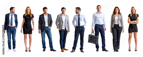 Business Professionals: A diverse group of professional individuals stand in a row, showcasing a range of business attire. They are ready for work, exuding confidence and professionalism.