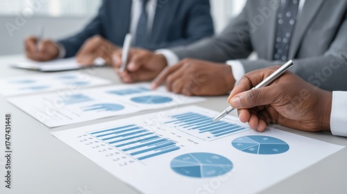 Business professionals analyzing charts and graphs in a modern office setting, focusing on data-driven decision making and teamwork in the financial sector